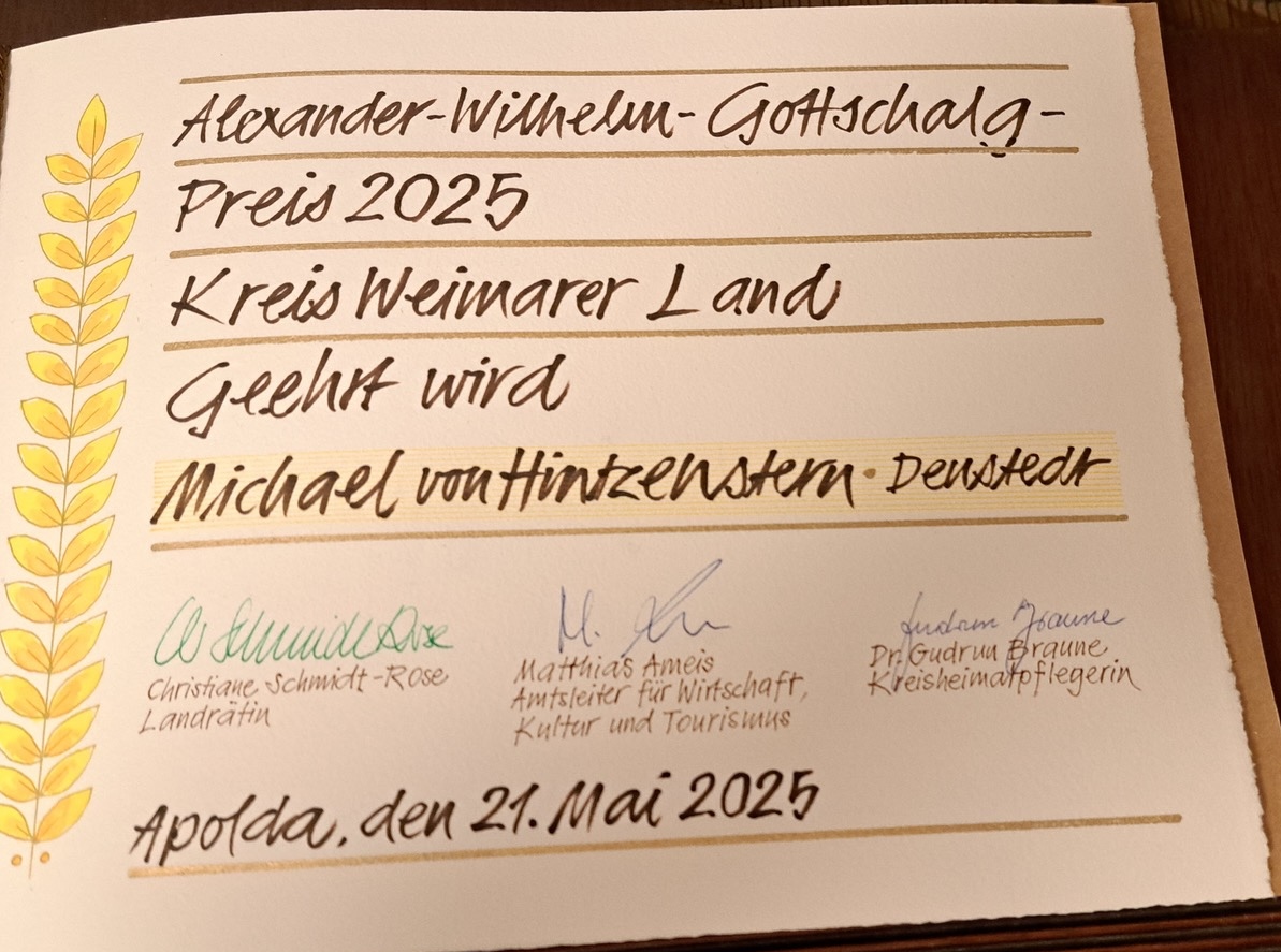 Aus der Urkunde des Alexander Wilhelm Gottschalg-Preises 2025, Landratsamt Weimarer Land